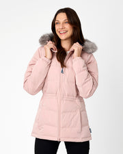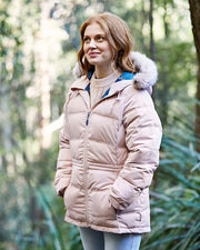 Ramp up the heat in our Elara Puffer, cosy, versatile and designed to take on cold, windy days with ease. As the first of its kind in the Rainbird range, it’s filled with 100% recycled synthetic insulation that traps warm, dry air to keep you comfortable. The soft peach finish outer, drop tail hem and adjustable hood with detachable faux fur trim deliver all day style and function.