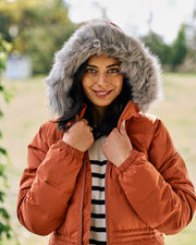 Ramp up the heat in our Elara Puffer, cosy, versatile and designed to take on cold, windy days with ease. As the first of its kind in the Rainbird range, it’s filled with 100% recycled synthetic insulation that traps warm, dry air to keep you comfortable. The soft peach finish outer, drop tail hem and adjustable hood with detachable faux fur trim deliver all day style and function.